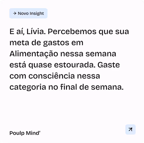 A Poulp Mind é uma IA proativa que analisa seus dados financeiros para identificar padrões de gastos, hábitos e oportunidades de melhoria.